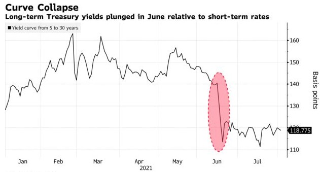 在美国国债市场最剧烈的波动之一中,5年期到30年期的收益率曲线在6月的三天时间里收窄了逾25个基点,这是自2020年3月市场波动达到峰值以来的最大跌幅。上述知情人士表示,Alphadyne曾重押收益率曲线变陡,但对曲线变化反应迟缓。