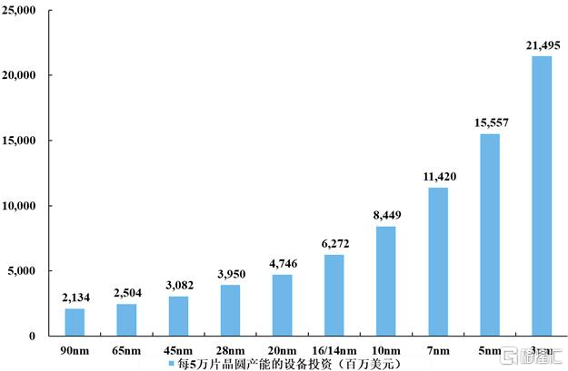 根据IBS统计,随着技术节点的不断缩小,半导体代工所需要的设备投入呈非线性的趋势。以5纳米技术节点为例,其投资成本高达数百亿美元,是14纳米的2倍以上,28纳米的4倍左右。