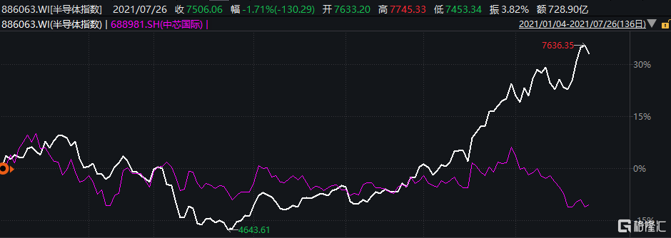 2021年3月至今,由于全球芯片慌叠加国产替代轰轰烈烈,A股半导体走出一波45度行情,网红基金经理蔡嵩松从菜狗再到蔡神。但在火热的半导体行情中,中芯国际股价却萎靡不振,在2021年2季度中跑输指数近50%。
