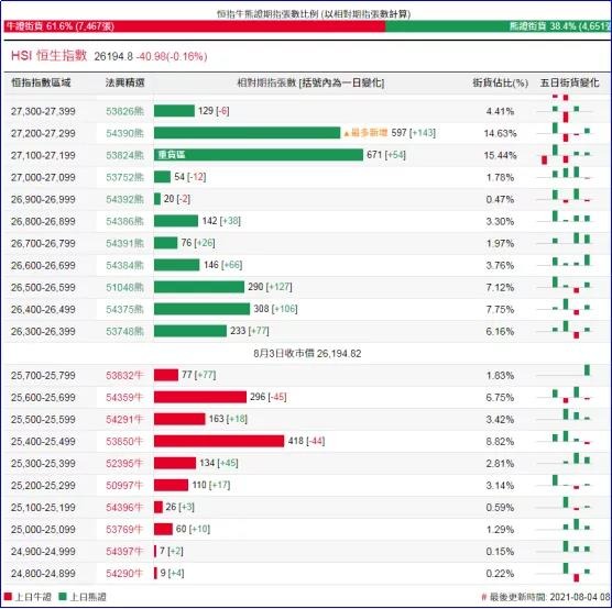 街货分布方面,至周二,恒指牛证街货在收回价25200点至25800点之间,累计相当约1198张期指合约;恒指熊证街货在收回价26300点至26900点之间,相当约1195张期指合约。