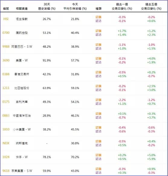 周二恒指相关权证的平均引伸波幅报约21.8%,按日变动不大。个股方面,腾讯相关权证的引伸波幅按日有明显上升;阿里、吉利、小米相关认购证的引伸波幅按日则有所下降。