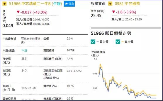 2、看错方向:中芯瑞通二一牛(51966.HK),周二大跌43.02%。