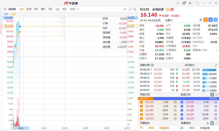 华盛资讯8月4日消息,次新股奈雪的茶盘中转涨,目前该股涨超4%,市值173亿港元,成交573万港元。
