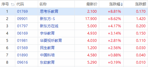 华盛资讯8月4日消息,教育股盘中发力,截止发稿,思考乐教育上涨8.81%;新东方-S上涨8.62%;新东方在线涨4.17%;宇华教育上涨3.14%;华夏视听教育上涨2.81%;民生教育上涨2.56%;中国科培、东软教育微涨。