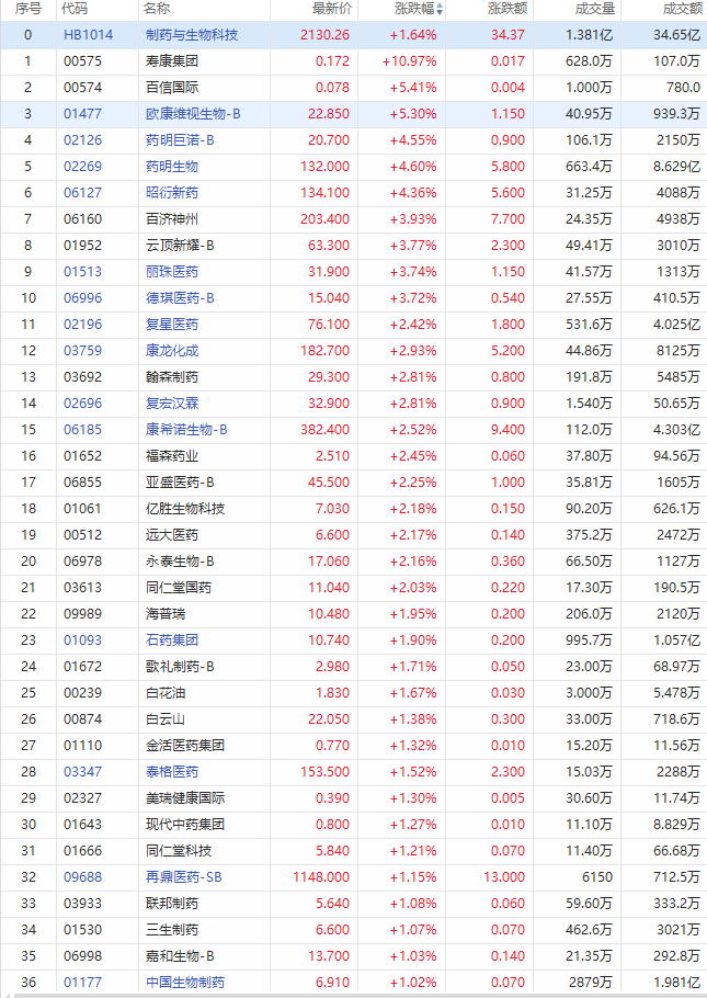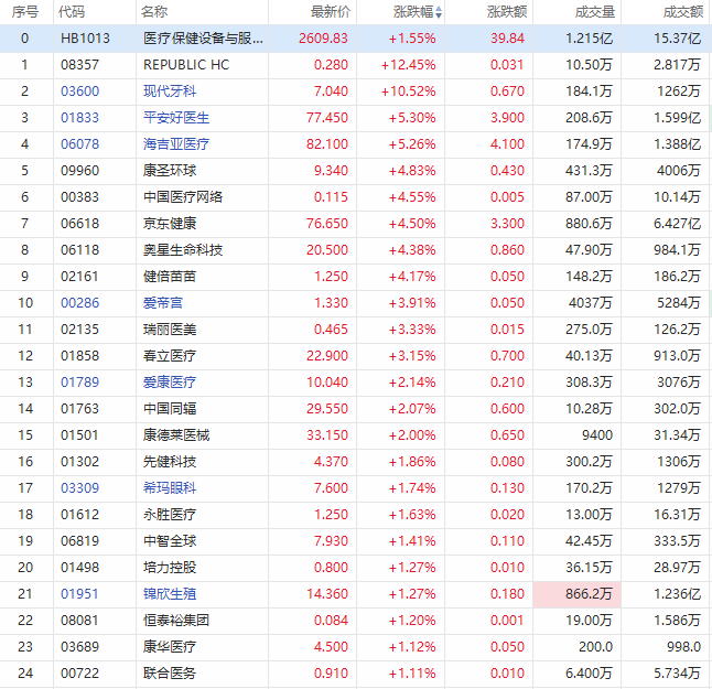 医疗设备及服务股亦上涨,目前现代牙科上涨10.52%;平安好医生、海吉亚医疗涨超5%;康圣环球、京东健康等涨超4%;爱帝宫、瑞丽医美等涨超3%。