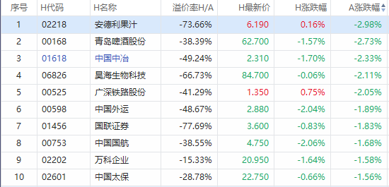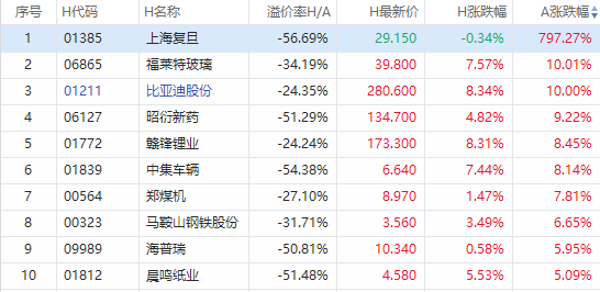 上海复旦,A股科创板上市首日收涨797.27%,H股截止发稿跌0.34%;福莱特玻璃A股涨10.01%,收涨停,H股截止发稿涨7.57%;比亚迪股份A股收涨停10.00%,H股截止发稿涨8.34%。昭衍新药A股涨9.22%,H股截止发稿涨4.82%。