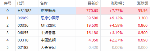 盘面上,华宝国际涨4.59%;中烟香港、中国波顿跟涨。