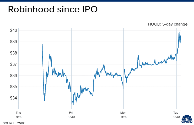 周二,Robinhood (HOOD) $HOOD 股价跳涨,升破首次公开募股(IPO)发行价,逆转上周上市首日的平淡表现。上周,该股登陆纳斯达克,上市首日开盘报38美元,开盘后不久就出现大跌,盘中一度大跌逾10%,当天收于35美元之下。在此后的几天里,Robinhood股价一直未能超越IPO价格,直到本周二出现逆转。