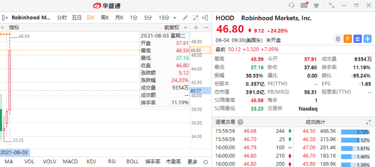 截至周二收盘,Robinhood涨超24%,至46.80美元,盘中一度飙升至48.59美元。上周,该股登陆纳斯达克,上市首日开盘报38美元,开盘后不久就出现大跌,盘中一度大跌逾10%,当天收于35美元之下。截至发稿,该股周三盘前涨超7%,报50.12美元。