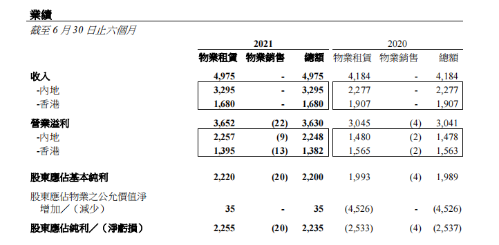 2021年上半年,恒隆地产实现收入49.75亿港元,同比增长19%,归母净利润22.35亿港元,上年同期亏损25.37亿港元,扭亏为盈。