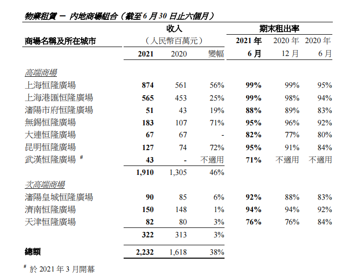 截至2021年6月,恒隆在内地已开业的购物中心共有10座,其中高端商场7座,上半年收入19.10亿,同比增长46%;次高端商场3座,上半年收入3.22亿,同比增长3%。高端商场与次高端商场的收入增速差距,异常明显。