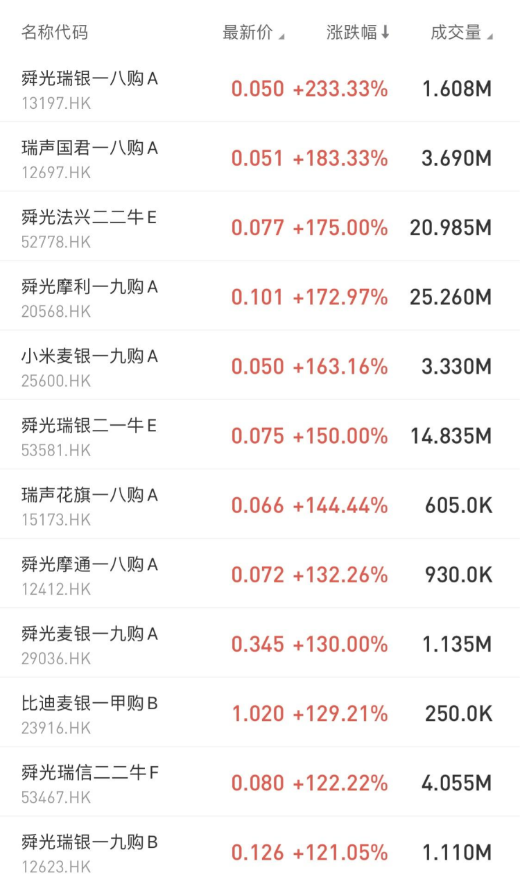 涨幅居前的包括: $13197.HK 舜光瑞银—八购A暴涨233.33%,占据排行榜第一; $12697.HK 瑞声国君—八购A涨183.33%; $52778.HK 舜光法兴二二牛E涨175%。