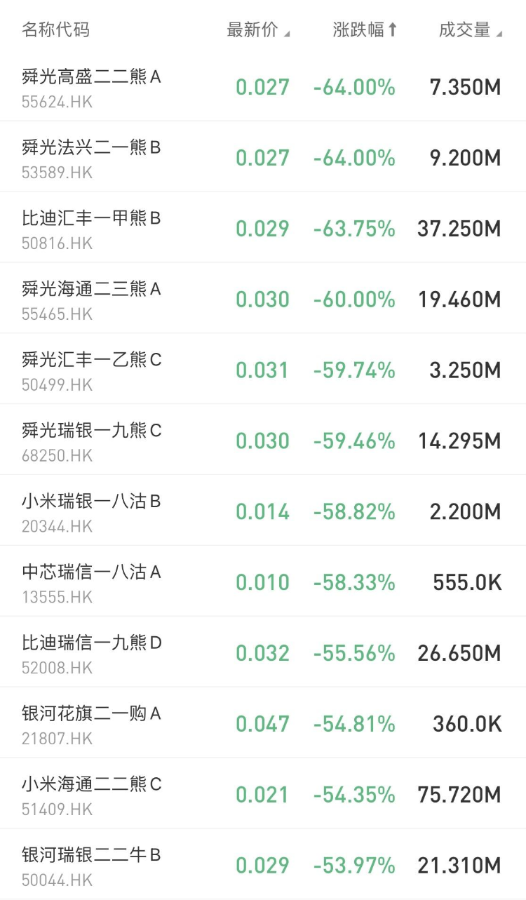 在今日跌幅榜中, $55624.HK 舜光高盛二二熊A跌64%; $53589.HK 舜光法兴二一熊B跌64%。