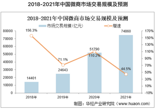 但无可否认,微商借助社交传播实现商品分销,具有极强的裂变能力。据华经产业研究院报告,2018年,国内微商市场交易规模已达1.44万亿元,2019年增长71.1%至2.46万亿元。