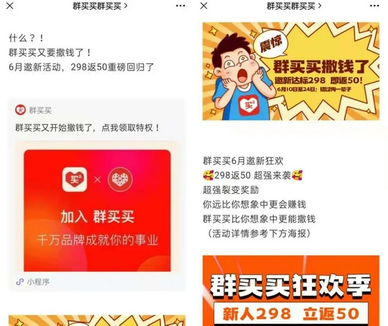 在6月,群买买似乎进入了产品推广期。当月,群买买推出一项拉新活动,老店主成功邀新后,当新店主业绩满298元,老店主可得50元拉新奖励。一位群买买店主表示,群买买正狂撒十个亿,“抓住机会!”