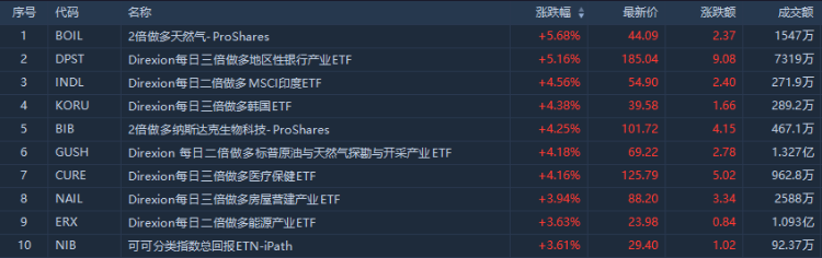 美股上个交易日涨幅前十的ETF