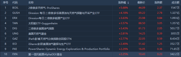 从ETF涨幅榜来看,涨幅居前的ETF集中在做多能源类。其中,2倍做多天然气ETF $BOIL 涨幅位居首位,收涨5.68%,成交1547万美元;每日两倍做多标普原油与天然气勘探与开采产业ETF $GUSH 涨4.18%,成交1.327亿美元。