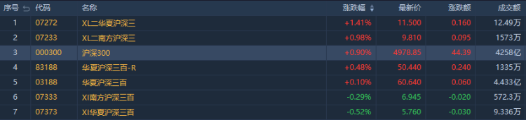 沪深300指数收涨0.90%。其中,华夏沪深三百ETF $03188.HK 涨0.1%,成交额约4.433亿港元;华夏沪深三百-R $83188.HK 涨0.48%,成交额达1335万港元。