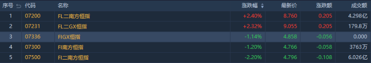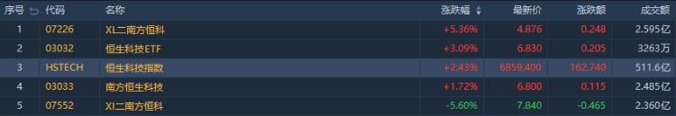 南方两倍做多恒科 $07226.HK 涨5.36%,成交额约2.595亿港元;