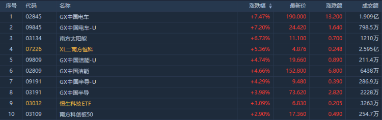 今日港股市场,涨幅居前的ETF主要集中在新能源车、洁能及半导体板块。GX中国电车ETF $02845.HK 大涨7.47%,成交1.909亿港元;GX中国电车-U $09845.HK 涨7.20%,成交798.5万港元。