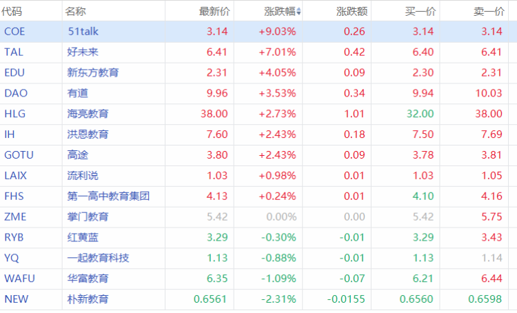 截至发稿,好未来涨超7.01%,新东方教育涨4.05%,有道涨3.53%,海亮教育、洪恩教育、高途涨超2%。