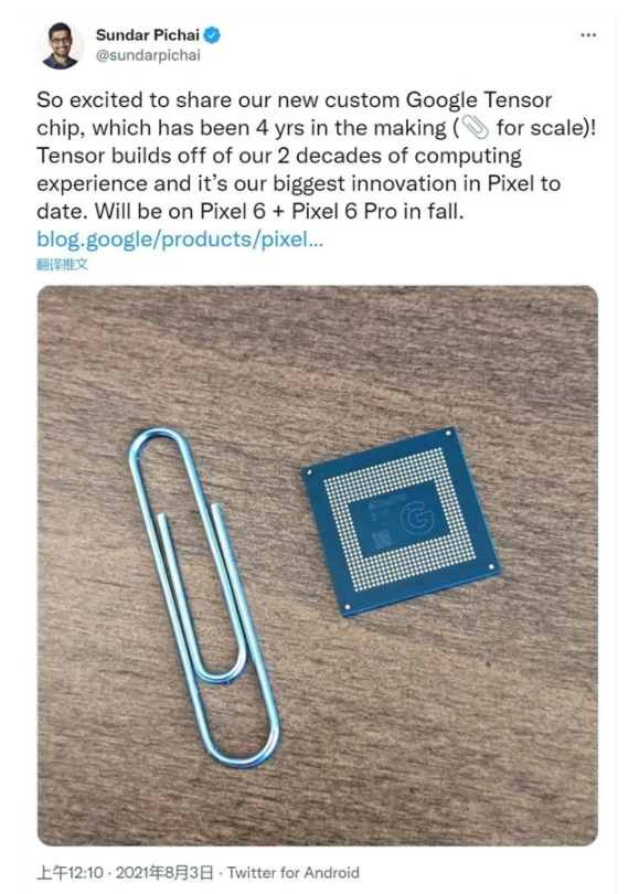 芯研所8月4日消息,谷歌及谷歌母公司Alphabet CEO Sundar Pichai在推特晒出了谷歌自研芯片Tensor。谷歌定制的Tensor芯片历时4年打造,是谷歌Pixel系列史上最伟大的创新,它将会被应用到今年秋季发布的谷歌Pixel 6和谷歌Pixel 6 Pro上。