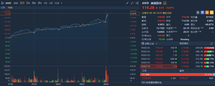 截至发稿,NeoPhotonics涨15.17%,AMD涨5.72%,日月光半导体涨3.04%,联电、慧荣科技涨超2%。