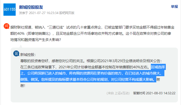 此外,近期有投资者向新城控股提问,关于房企拿地金额控制在年销售额40%一事,得到的答复是确有其事,而公司的应对策略是“将优先的资源用在更有价值的地方,在已进入的城市做大、做强、做深”。