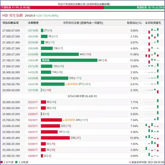 街货分布方面,至周三,恒指牛证街货在收回价25400点至26100点之间,累计相当约1125张期指合约;恒指熊证街货主要在收回价26600点至27300点之间,相当约1956张期指合约。