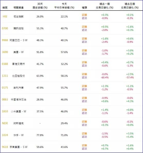 周三恒指相关权证的平均引伸波幅报约22.1%,按日小幅调升。个股方面,腾讯控股、阿里巴巴、美团、吉利、小米相关认沽证的引伸波幅按日有明显下降;吉利、小米、阿里巴巴相关认购证的引伸波幅按日上调。