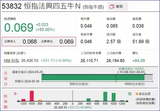 1、强势轮证:恒指法兴四五牛(53832.HK),周三大涨50.00%;