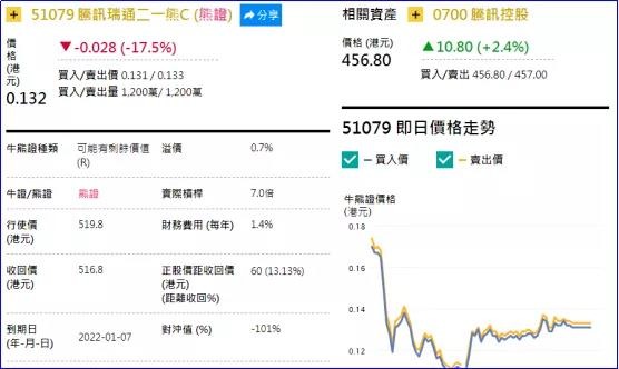 2、看错方向:腾讯瑞通二一熊(51079.HK),周三大跌17.50%。