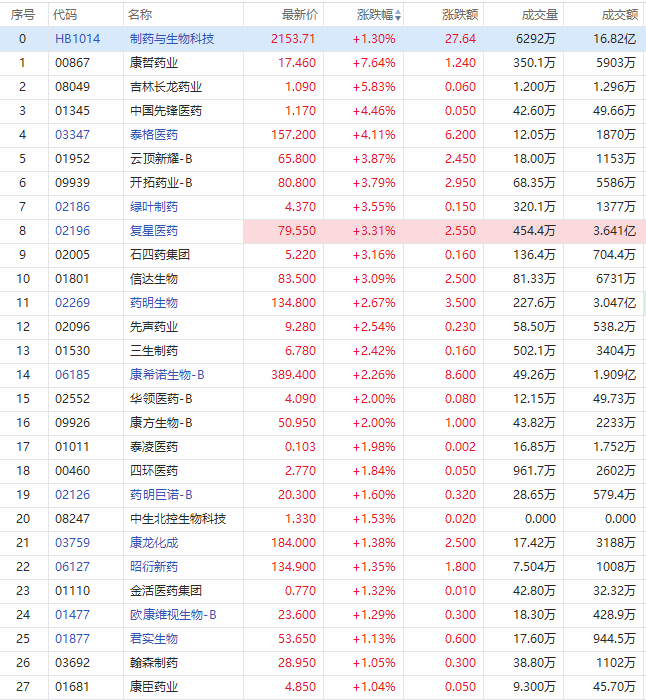 华盛资讯8月5日消息,生物制药板块集体走强,截止发稿,康哲药业上涨7.64%;泰格医药上涨4.11%;云顶新耀-B、开拓药业-B、复星医药、信达生物涨超3%;药明生物、先声药业、三生制药、康希诺生物-B等涨超2%;康方生物-B、四环医药、康龙化成等涨超1%。