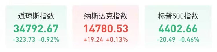 道指跌323.73点,或0.92%,报34792.67点;纳指涨19.24点,或0.13%,报14780.53点;标普500指数跌20.49点,或0.46%,报4402.66点。