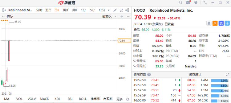 在上市首日(上周四)遭遇破发并跌超8%后,“美国散户大本营”Robinhood本周迎来“两连涨”。继昨日大涨24%后,截至周三美股收盘,Robinhood股价飙升50.4%,报70.39美元,使其周涨幅超过100%。