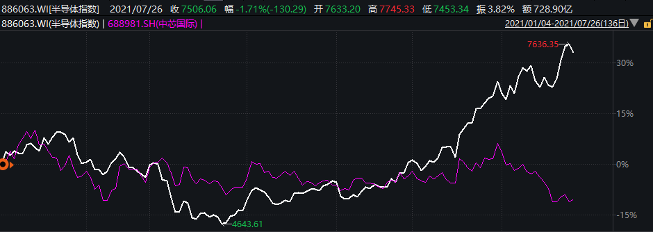 2021年3月至今,由于全球芯片慌叠加国产替代轰轰烈烈,A股半导体走出一波45度行情,网红基金经理蔡嵩松从菜狗再到蔡神。但在火热的半导体行情中,中芯国际股价却萎靡不振,在2021年2季度中跑输指数近50%。