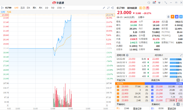 新特能源(01799)午后复牌,股价飙升逾20%,截至发稿,涨20.17%,报23港元,成交额8亿港元。