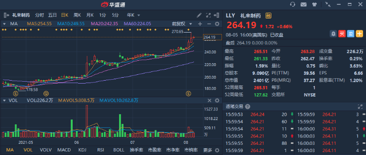 礼来制药在本周三(8月4日)盘中触及股价历史新高,报270.65美元/股 。该股今年内涨幅已达56.24% 。