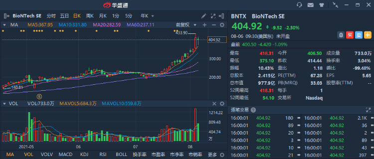 2、 今年以来mRNA技术备受市场关注,掌握核心技术的BioNTech(BNTX) 将于下周公布Q2业绩,彭博分析师预计其营收或同比增长超82倍。