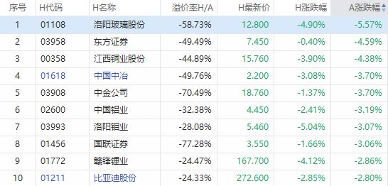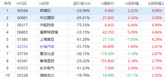 郑煤机A股收涨停9.98%,H股截止发稿涨3.22%;中芯国际A股涨5.08%,H股截止发稿涨3.54%;长城汽车A股涨3.41%,H股截止发稿涨1.66%;上海复旦A股涨4.29%,H股截止发稿跌7.65%。