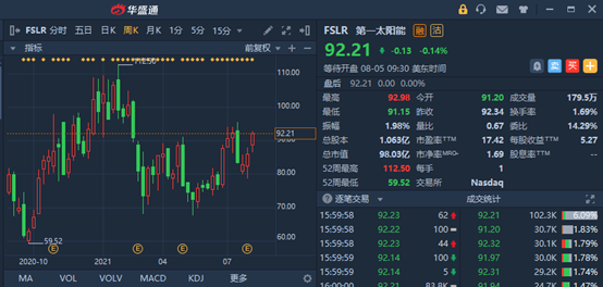″第一太阳能在3月和5月形成不错的双底形态之后,股价不断走高,最近又稍微回落,如果之后该股能在94美元上方再创新高,那么这就是一只吸金能力很强的优质股” Maley说道。