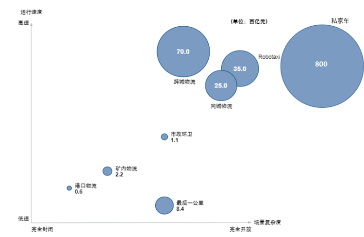 商用车有图森和智加这样的跨城物流7000亿,大部分在高速上行驶,应用环境有优势。同城物流类似于仓配到店有2500亿,美团和快递公司取代快递员和外面员的无人配送小车属于最后一公里,有840亿。