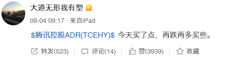 8月4日,段永平在公开平台称,今天买了点腾讯,并表示,再跌再多买些。