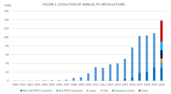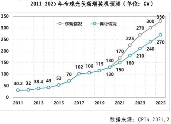 根据IEA(国际能源署)统计数据显示,2020年光伏发电量提升了20%。中国光伏行业协会预计2021年全球光伏市场规模仍将加速扩大,总装机量将达到150-170GW,创历史新高。到2025年,乐观估计将超过300GW。