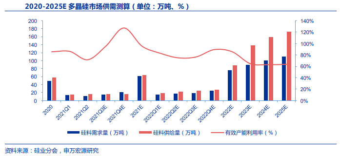 从行特征来看,多晶硅具有化工行业属性,存在技术及资金双重高壁垒。例如高纯度要求、高设备投资以及较长的扩产周期,这些壁垒帮助多晶硅行业构筑了天然的护城河。申万宏源证券预计,得益于光伏装机需求的提升,多晶硅需求量将在2025年达到110.2万吨,5年复合年增长率高达17.4%。
