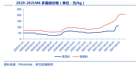 而在价格端,自2020年下半年后硅料价格持续攀升,截至2021年6月,多晶硅致密料价格已经达到206元/千克,相比2020年6月涨幅高达249%。而更大的产能在短期内无法得到有效释放,多晶硅价格在2021年将维持在相对高位。