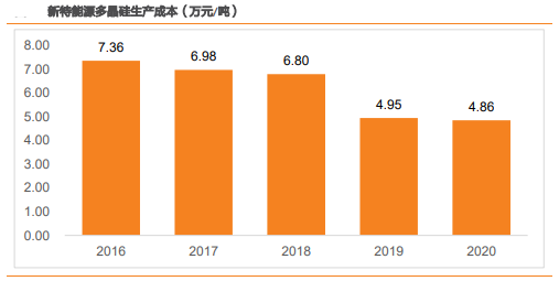 成本端,新特能源拥有极强的技术研发实力,通过改良设备和工艺,2020年公司硅料单位生产成本降至4.86万/吨,较2016年下降了34%。随着公司2万吨技改项目和内蒙古10万吨硅料项目投产,天风证券认为未来生产效率有望继续提升,规模效应将继续推动公司成本下行。