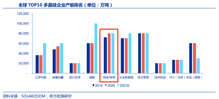 新特此次筹资准备建设的多晶硅项目,是光伏产业链最上游原料。一般通过化学反应从硅金属中提炼高纯度多晶硅,以备下游进一步拉晶、切片形成光伏用硅片。