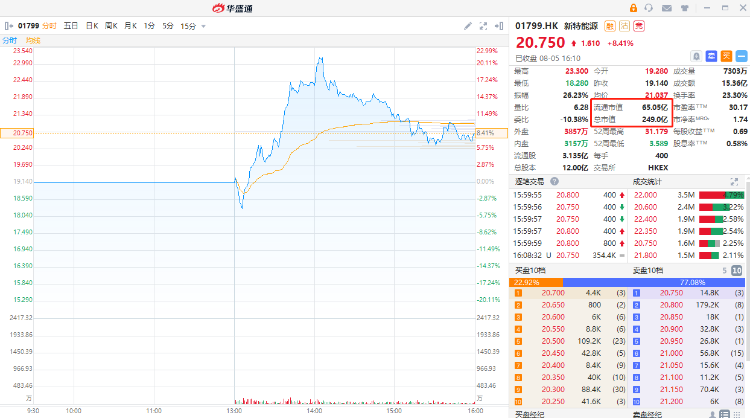 截至8月5日收盘,公司股价冲高回落仍收涨8.41%报20.75港元,总市值约为250亿港元。
