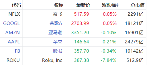 截至发稿,Roku跌7.84%,报387.38美元,脸书跌0.34%,奈飞涨0.05%。